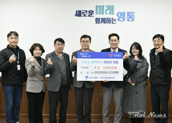 [ 로이뉴스(Roi News) 이지수 기자 ] 수원시 영통구는 지난 24일 한국자산관리공사 경기지역본부에서 관내 경제적으로 어려움을 겪는 이웃을 위해 성금 500만 원을 기부했다고 밝혔다.
