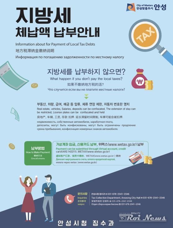 지난달 기준, 안성시의 외국인 지방세 체납자는 1,014명, 체납액은 2억 7천여만 원에 달한다. 이에 따라 시는 거소지가 불확실하거나 납부 의지가 없는 외국인 체납자 723명에 대하여 외국인 전용보험 자료를 조회 의뢰한 후, 15명에 대하여 압류 조치를 시행했다.