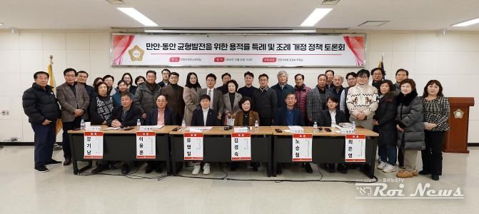 [ 로이뉴스(Roi News) 이지수 기자 ] 안양시의회 김경숙 의원(국민의힘, 석수1·2동·충훈동)은 12월 24일 시의회 소회의실에서 '만안·동안 균형발전을 위한 용적률 특례 및 조례 개정 정책토론회'를 개최하고, 만안과 동안 간 개발 격차 해소를 위한 다양한 정책 대안을 논의했다.