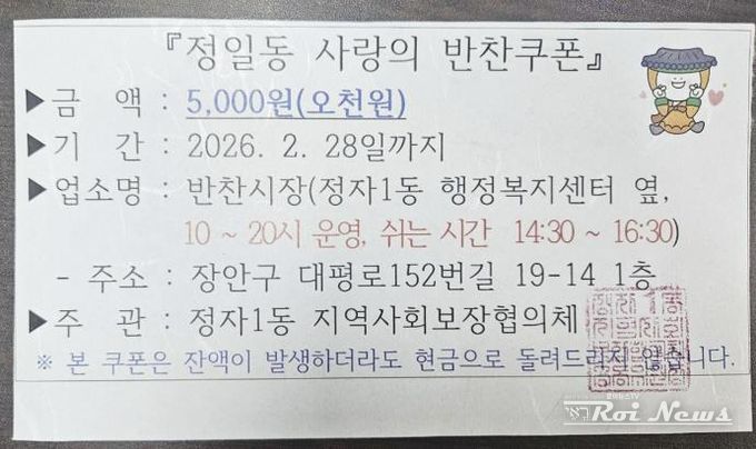 [ 로이뉴스(Roi News) 이지수 기자 ] 수원시 장안구 정자1동 지역사회보장협의체는 금년부터 관내 취약계층 가구를 대상으로 매월 5가구에 2만원 상당의 반찬쿠폰을 지급하는 사업을 시작한다고 지난 13일 밝혔다.