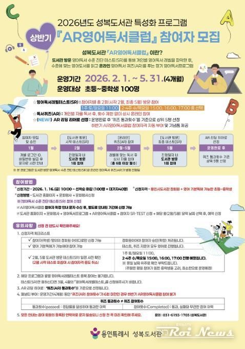 [ 로이뉴스(Roi News) 이지수 기자 ] 용인특례시 성복도서관은 오는 16일부터 2026년 ‘AR(Accelerated Reader)영어독서클럽’ 상반기 참여자 100명을 모집한다고 15일 밝혔다.