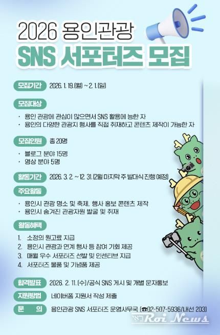 [ 로이뉴스(Roi News) 이지수 기자 ] 용인특례시는 2월 1일까지 용인의 관광자원과 다채로운 축제·행사를 시민의 시각에서 생동감 있게 홍보할 ‘용인관광 SNS 서포터즈’를 모집한다고 20일 밝혔다.