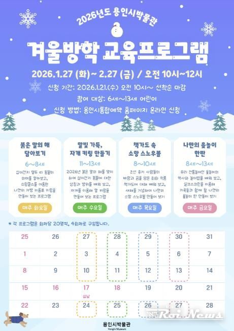 [ 로이뉴스(Roi News) 이지수 기자 ] 용인시박물관은 어린이들이 역사와 전통문화를 쉽고 재미있게 체험할 수 있는 ‘2026년 겨울방학 교육 프로그램’을 운영한다고 20일 밝혔다.