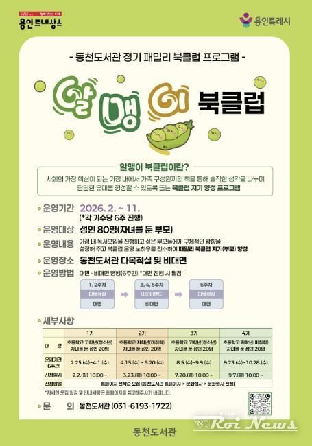 [ 로이뉴스(Roi News) 이지수 기자 ] 용인특례시 동천도서관은 오는 2월 2일부터 선착순으로 ‘알맹이 북클럽’ 참가자를 모집한다고 26일 밝혔다.