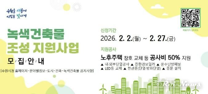 [ 로이뉴스(Roi News) 이지수 기자 ] 수원특례시가 2월 2일부터 27일까지 ‘2026년 녹색건축물 조성 지원사업’ 신청을 받는다.