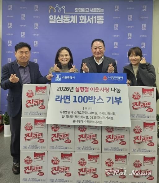 이번 기부는 유정빌딩 입주상가인 ▲스마트한결치과의원 ▲역북집 화서점 ▲언니들의 미장원 화서점 ▲GS25 화서오거리점 ▲유니베라 수원화서대리점이 지역 내 어려운 이웃을 돕기를 위해 뜻을 모아 마련했으며, 기부된 라면 100박스는 화서1동 행정복지센터를 통해 관내 저소득층 및 취약계층 가구에 전달될 예정으로, 설 명절을 앞두고 따뜻한 나눔의 의미를 더했다.
