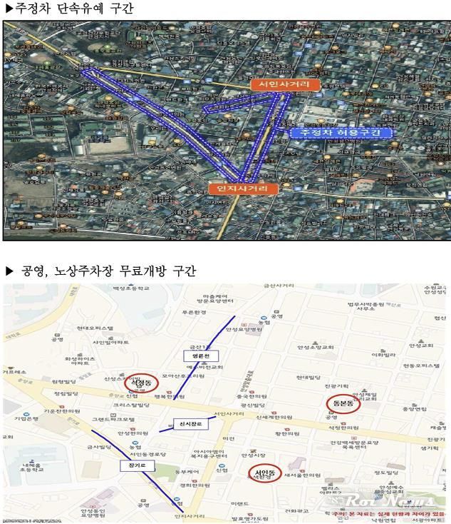 주정차 단속 유예 구간은 안성맞춤시장(서인사거리~인지사거리 구간 양측 300미터)과 중앙시장(서인사거리~안성농협 양측 100미터, 석정삼거리~인지사거리 양측 500미터) 주변 도로이며, 서인동·동본동·석정동의 건축식 공영주차장과 전통시장 주변 노상주차장이 무료 개방된다.
