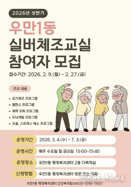 [ 로이뉴스(Roi News) 이지수 기자 ] 수원시 팔달구 우만1동은 관내 어르신들의 건강 증진을 위해 2월 9일부터 2월 27일까지 ‘2026년 상반기 실버체조교실’ 참여자를 선착순으로 모집한다고 밝혔다.