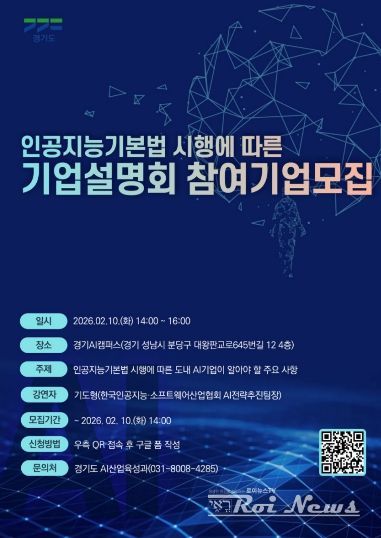 [ 로이뉴스(Roi News) 이지수 기자 ] 경기도가 지난 1월 22일 시행된 ‘인공지능 기본법’에 대한 도내 기업들의 이해를 돕기 위해 10일 오후 2시 판교 경기AI캠퍼스에서 AI 기업 대상 설명회를 개최한다.