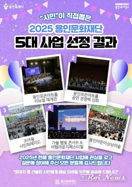 [ 로이뉴스(Roi News) 이지수 기자 ] 용인문화재단은 시민 참여 온라인 투표를 통해 ‘시민이 선정한 2025년 용인문화재단 5대 사업’을 발표했다.