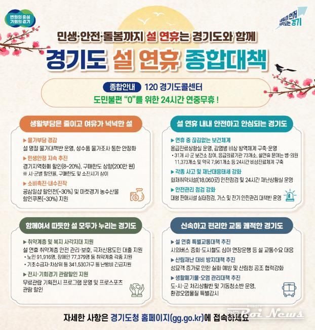 [ 로이뉴스(Roi News) 이지수 기자 ] 경기도가 도민들이 따뜻하고 편안한 명절을 보낼 수 있도록 ‘설 연휴 종합대책’을 추진한다.