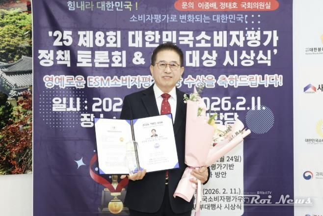 [ 로이뉴스(Roi News) 이지수 기자 ] 지난 11일, 국회 도서관에서 열린 2026 제8회 ESM대한민국소비자평가우수대상 정책토론회 및 시상식에서 광주시의회 허경행 의장이 지방자치/행정 부문 대상을 수상했다.