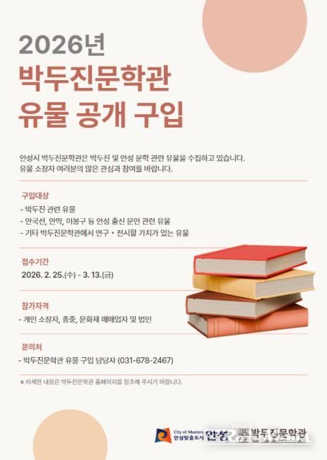 유물 구입 서류 접수 기간은 2월 25일부터 3월 13일까지다. 매도를 희망하는 개인이나 법인은 안성시청 홈페이지에서 서식을 내려받아 작성한 뒤, 등기우편 또는 전자우편으로 제출하면 된다.