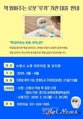 [ 로이뉴스(Roi News) 이지수 기자 ] 경기도교육청평생학습관이 수원시 소재 어린이집과 유치원을 대상으로 책 읽어주는 로봇 ‘루카(Luka)’와 ‘연계도서 꾸러미’ 대출 서비스를 운영한다.