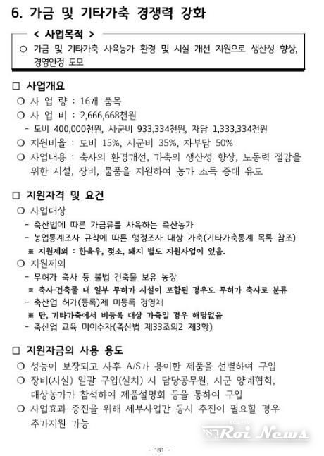 ‘가금 및 기타가축 사육농가 지원사업’은 시설 현대화를 통한 축사 환경 개선, 방역 물품 지원 등을 통한 생산성 향상이 주요 내용이다.