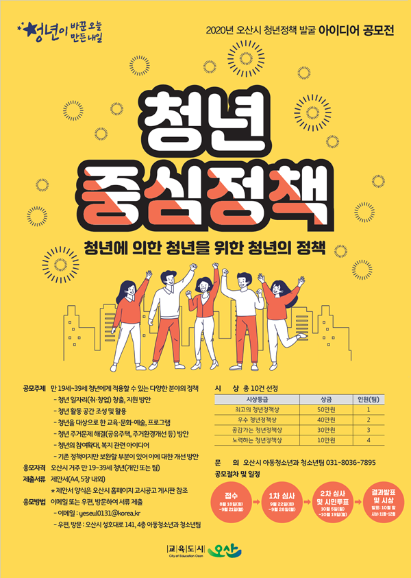 오산시(시장 곽상욱)는 청년들의 눈높이 맞춘 정책을 발굴하고 반영하기 위해 ‘청년정책 발굴 아이디어 공모전’을 개최한다.