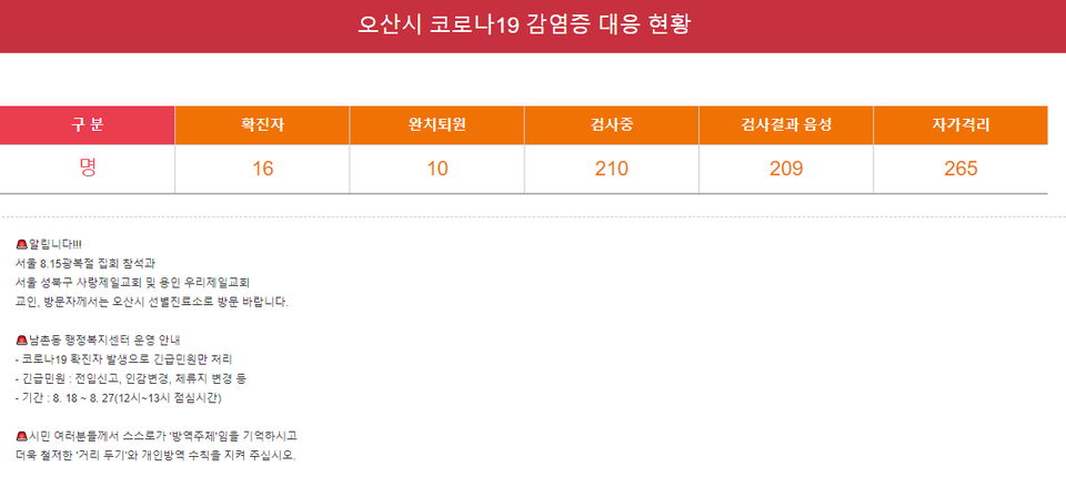 - 검체채취 : 오산시보건소 선별진료소(8. 19)