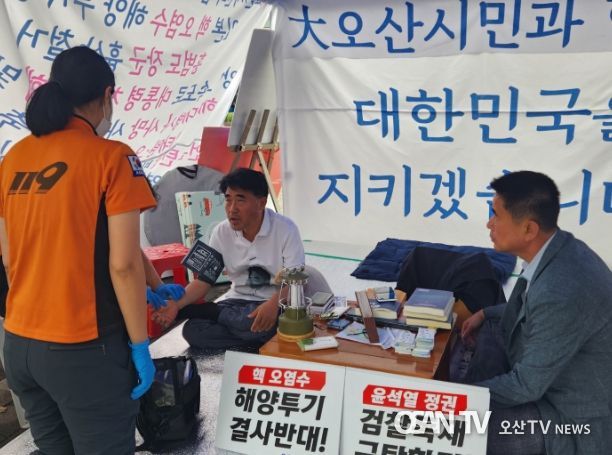 [ 오산TV 이경호 기자 ] 오산시의회 성길용 의장은 이신남 전 청와대 비서관이 시청광장에서 보름째 이어가는 후쿠시마 핵 오염수 해양투기, 독립 역사 지우기 등 현 정부 실정에 대한 항의 차원의 단식을 중단할 것을 촉구하는 성명서를 지난 19일 발표했다.