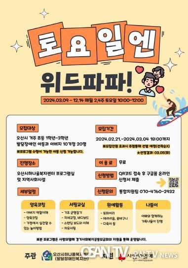 모집 대상은 오산시에 거주하는 초등학생 1~3학년 발달장애인 아동과 아버지 10가정이다. 참가를 원하면 3월 4일 오후 6시까지 QR코드로 신청하거나 오산시하나울복지센터로 연락하면 안내받을 수 있다.