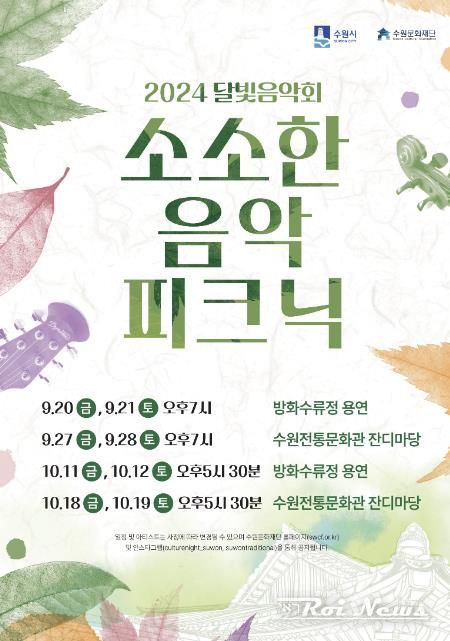 [ 로이뉴스(Roi News) 이경호 기자 ] 수원문화재단은 9월 20일부터 10월 19일까지 매주 금, 토(10월 첫째 주 제외) 방화수류정 용연과 수원전통문화관 잔디마당에서 2024 달빛음악회 '소소한 음악 피크닉'이 펼쳐진다.