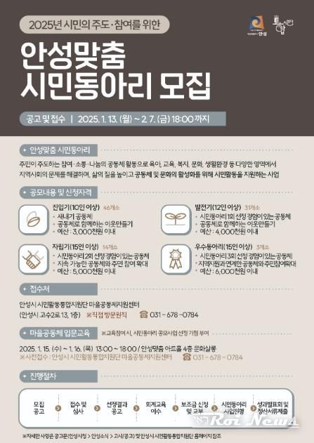 [ 로이뉴스(Roi News) 이지수 기자 ] 안성시 시민활동통합지원단 마을공동체지원센터는 지난13일에 ‘2025년 주민주도·참여를 위한, 안성맞춤 시민동아리 지원 공모사업’(이하 시민동아리)을 공고했다.