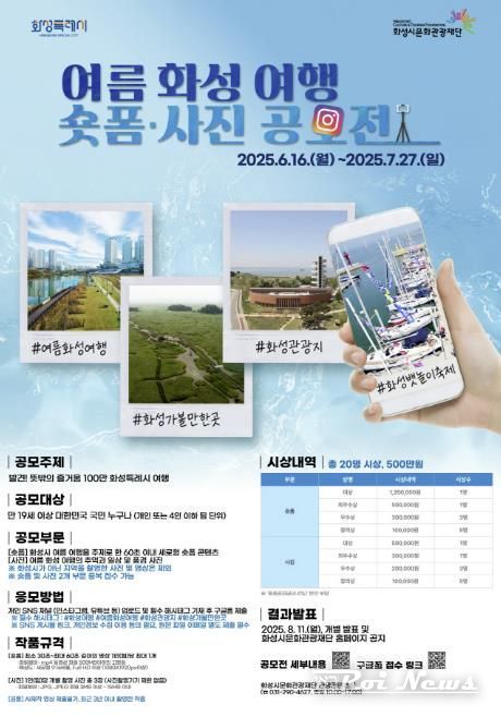 [ 로이뉴스(Roi News) 이지수 기자 ] 화성시문화관광재단은 화성시의 우수한 관광자원과 숨겨진 관광 명소 발굴을 위해 '2025 화성 여름 여행 사진·숏폼 공모전'을 개최한다.