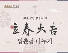 [ 로이뉴스(Roi News) 이지수 기자 ] 수원박물관이 2026 수원 방문의 해를 맞아 1월 31일 오후 1시부터 3시까지 박물관 1층 로비에서 세시(歲時) 행사 ‘입춘첩 나누기’를 연다. 관람객에게 서예가 근당 양택동 선생의 친필 입춘첩을 배부한다. 입춘첩은 새해 첫 절기인 입춘에 액운을 막고 행운과 건강을 기원하며 대문이나 기둥에 붙이는 글귀다. 참가자는 ‘입춘대길 만사여의(立春大吉 萬事如意)’ 등 사전 선정한 문구 가운데 하나를 선택할 수 있다. 참가비는 1인당 1000원이며, 현장에서 신청해야 한다. 수원박물관 관계자는 “새해 첫 절기인 입춘에 전통 세시풍속을 시민들과 함께 나누기 위해 ‘입춘첩 나누기’ 행사를 매년 열고 있다”며 “박물관을 찾아 한 해 소망을 담은 입춘첩을 받으시고, 건강하고 행복하게 병오년을 보내시길 바란다”고 말했다.