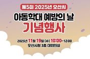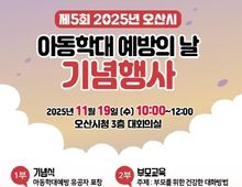 [ 로이뉴스(Roi News) 이지수 기자 ] 오산시는 오는 19일 ‘아동학대예방의 날’과 ‘아동학대예방주간’을 맞아 기념행사 및 온·오프라인 캠페인을 실시한다고 12일 밝혔다. 행사는 19일 오전 10시부터 12시까지 오산시청 대회의실에서 진행되며, ▲1부 아동학대예방의 날 기념식 식전공연, 유공자 표창 시상, 퍼포먼스, ▲2부 부모교육 특별강연으로 구성된다. 특별강연은 리플러스 인간연구소 박재연 소장이 ‘부모를 위한 건강한 대화방법’을 주제로 진행한다. 매년 11월 19일은 아동학대 예방과 방지에 대한 사회적 관심을 높이기 위해 제정된 법정기념일로, 오산시는 매년 기념식과 강연, 캠페인 등을 통해 아동학대 예방의 중요성을 알리는 다양한 활동을 추진해오고 있다. 시는 이달 25일까지 온라인 릴레이 캠페인도 함께 진행한다. 오산시민 누구나 SNS에 아동학대예방 메시지 또는 관련 사진을 업로드해 참여할 수 있다. 또한 11월 24일에는 시청 인근 주요 교차로에서 시민 대상 오프라인 홍보 캠페인을 실시해 아동학대 예방 인식 제고에 나설 예정이다. 박현주 아동복지과장은 “이번 행사가 아동학대 예방의 중