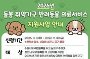 [ 로이뉴스(Roi News) 이지수 기자 ] 수원특례시는 돌봄 취약가구의 반려동물 양육 부담을 덜고 동물복지를 강화하기 위해 ‘2026년 돌봄 취약가구 반려동물 의료서비스 지원사업’을 추진한다. 지원 대상은 수원시에 주민등록을 두고 실제 거주하며 본인 명의로 반려동물을 등록해 기르는 기준중위소득 85% 이하 가구다. 저소득층, 중증장애인, 한부모가정, 다문화가정, 1인가구 등이 포함된다. 경기도 공공입양기관에서 국가봉사동물을 입양한 경우는 소득과 관계없이 지원한다. 보호자 1명당 2마리까지 신청할 수 있다. 동일 동물은 ‘의료·돌봄·장례 지원’ 또는 ‘노령동물 종합건강검진’ 중 한 가지 항목만 선택해 지원한다. 의료·돌봄·장례 지원은 마리당 최대 16만 원(초과비용 자부담), 노령동물 종합건강검진은 최대 32만 원(초과비용 자부담)까지 지원한다. 노령동물 검진은 2019년 12월 31일 이전 출생한 반려동물에 한한다. 의료지원에는 백신접종, 중성화수술, 기본검진·치료비 등이 포함되고, 돌봄 위탁비와 장묘 서비스도 지원한다. 노령 반려동물은 종합건강검진을 받을 수 있으며 모든 서비스는 관내 업체를