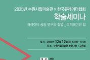[ 로이뉴스(Roi News) 이지수 기자 ] 경기도 수원시립미술관은 한국큐레이터협회와 함께 2025년 학술 세미나 '큐레이터 공동 연구와 협업-코퍼레이션 힙'을 주제로 12월 12일 오후 1시 수원시립미술관 행궁 본관에서 개최한다. 이번 세미나는 기관과 기획자 간 연구의 지평을 확장하는 담론의 장을 위해 수원시립미술관과 한국큐레이터협회가 업무협약을 체결하고 공동 연구와 협업 사례를 조명한다. 세미나는 “큐레이터 공동 연구와 협업-코퍼레이션 힙”을 주제로 김현숙 KISO미술연구소 소장이 한일 공동 연구 전시 사례로서 《한일 근대미술가들의 눈》의 연구 과정을 발표하며 세미나의 첫 문을 연다. 전북도립미술관 이애선 관장은 “빈손의 연대, 가득한 변화 – 연대는 선택이 아닌 책임”이라는 주제로 전라북도 소재 예술기관들의 협업과 연대 사례를 살펴보며, 이영준 김해문화관광재단 정책홍보팀장은 공동 연구와 협업 전시가 어우러진 사례로서 “문예회관 전시실, 협업과 연대로 풀어보는 대안들”을 발표한다. 2부에서는 한국화학연구원 고영주 전문경영위원이 “대전 과학예술 융합 사례”에 관한 연구를 공유하고, 박지영 독립큐레이터는 경남도립미술관에